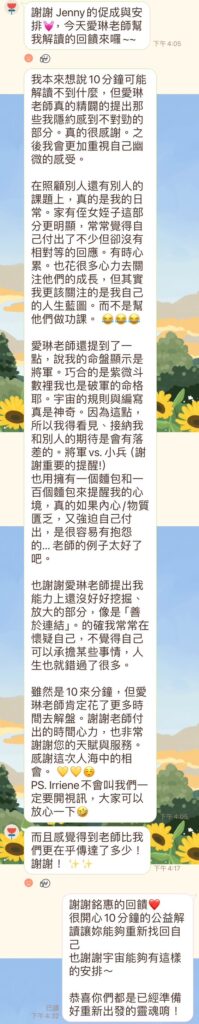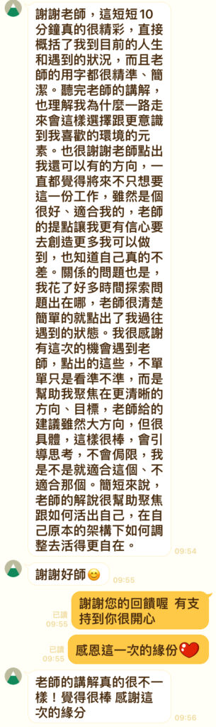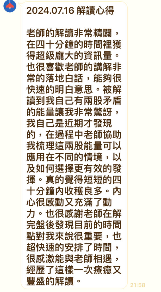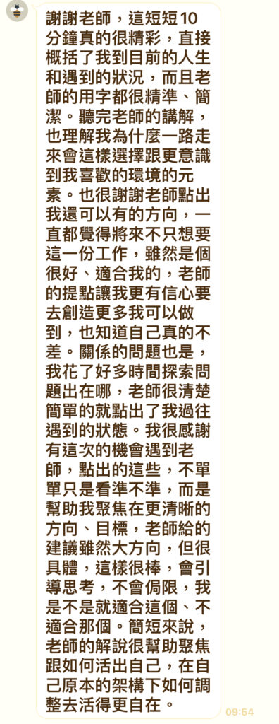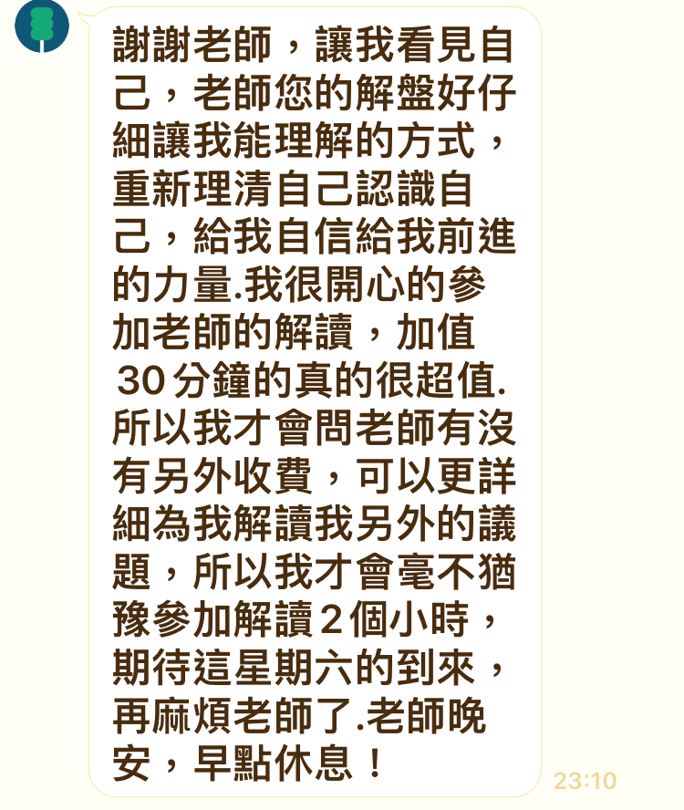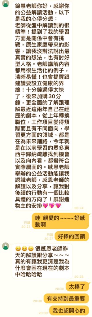 錦慧老師耐心又專業的解說,讓我用新的視角重新看待自己的命盤,了解自己的天賦,看清自己的特質..