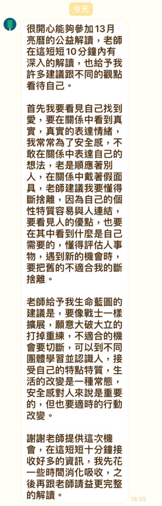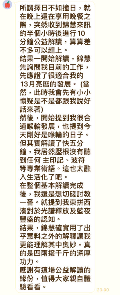 錦慧老師的解讀跟授課都是超級認真跟熱情,從中學到了很多,也讓人更清楚自己的人生藍圖。而且光簡單的解讀就會讓你看到完全不一樣的自己,或者是貼近現實的現況,讓人覺得雖然是相較於傳統命理很不一樣的東西,但錦慧老師把她落地了,然後感覺得出他她真心希望你好!是個用熱情在推廣13月亮曆的老師。